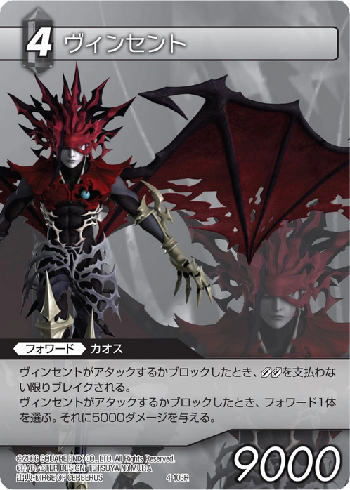 Vincent appears in many cards in the Final Fantasy Trading Card Game. His cards are either earth or dark-elemental.